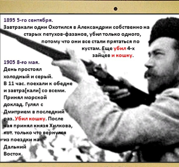 Да и его потомок Святой царь-мученик Николай II , согласно записям в его дневнике, регулярно добывал кошек к своему столу, наряду с другой дичью :