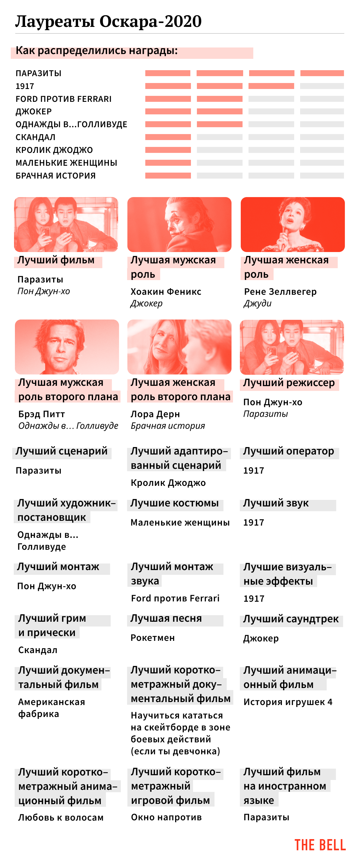 - Как и предшествовавшая ему церемония вручения наград «Золотой глобус», «Оскар» стал провалом для большой делегации номинантов от стриминговой платформы Netflix — фильмы студии во главе с «Ирландцем» Мартина Скорсезе получили только два «Оскара» (Лора Дерн — актриса второго плана, «Американская фабрика» — лучший документальный фильм).