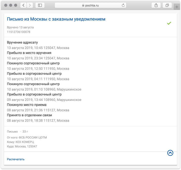 На сайте «Почты России» существует система отслеживания посылок и заказных писем. «Медуза» путем перебора номеров отслеживания почтовых отправлений обнаружила, что письма от Центра оперативно-технических мероприятий ФСБ в августе были направлены вот этим сайтам: