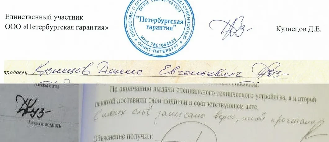 Последний свидетель — Денис Кузнецов. Он в августе-сентябре 2018 года успел побывать зицпредседателем ООО «Петербургская гарантия», которое, по данным «Новой», находится в сфере интересов Евгения Пригожина. Но это не самое важное. В нашем распоряжении оказался нотариальный документ, подписанный Денисом Кузнецовым. Его подпись в этом документе совпадает с подписью в паспорте. Но подпись и почерк в нотариально заверенной бумаге разительно отличаются от его подписи и почерка в актах, составленных оперативниками ГУПЭ и в полученном ими объяснении. Разница очевидна без специалиста-графолога.