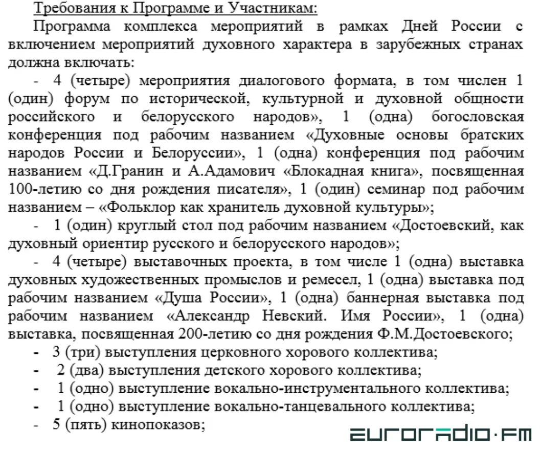 К подбору участников для «диалоговых мероприятий» нужно подойти со всей серьёзностью. Они должны «поддерживать идеи продвижения ценностей духовной культуры России и её роли в сохранении исторического и культурного наследия России и Беларуси».