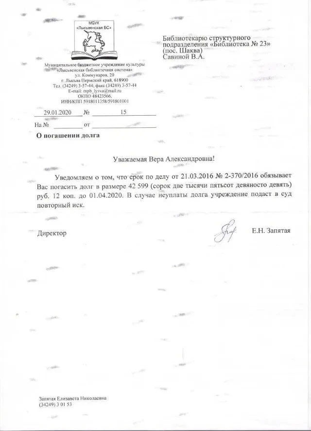 «Меня вызывали на «ковер», ругали, но я говорила, что они сами виноваты, что согласились на подключение интернета на таких условиях», — вспоминает библиотекарь. Начальство имеет на этот счет свою точку зрения: их решение — Савиной необходимо погасить долг самой. К тому же выяснилось, что казенный ноутбук и казенный модем, которые от местных властей для библиотеки самой Вере приходилось выбивать с потом и кровью, она иногда уносила домой на вечер, чтобы там закончить работу. Сама Савина не считает это чем-то предосудительным, поскольку ее сыновья (тогда несовершеннолетние) тоже помогали ей искать в интернете нужную литературу. Но для местных властей это стало только отягчающим обстоятельством.