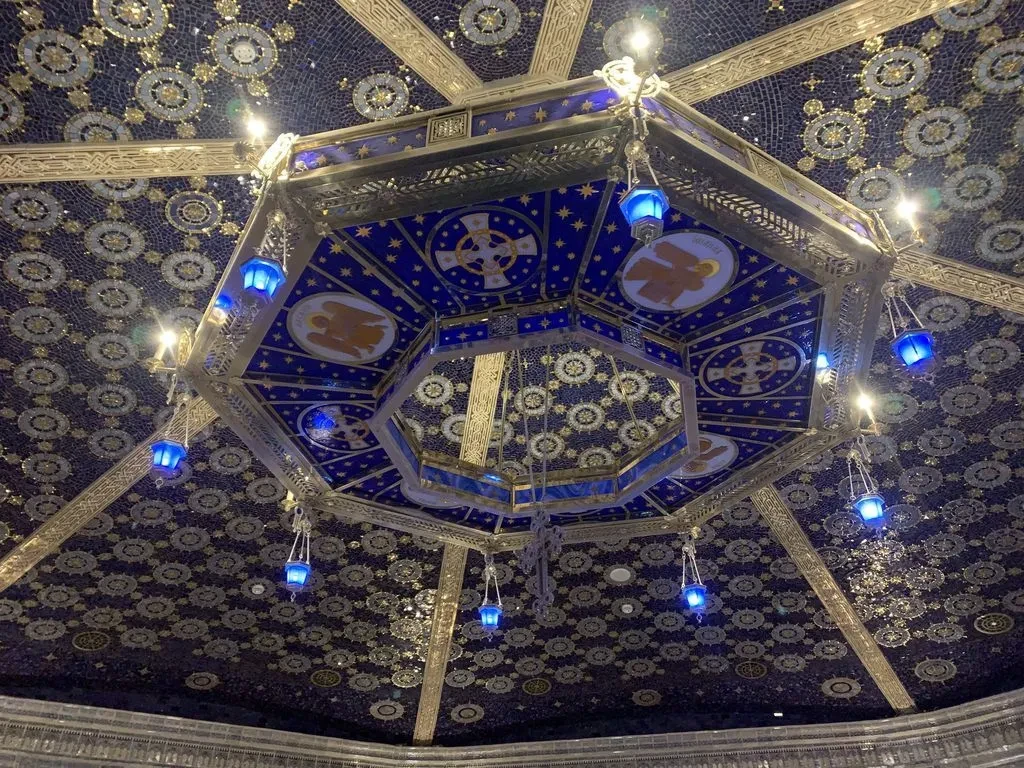 Главный цвет как наружных стен, так и внутренней отделки храма — хаки, будто храм готовится десантироваться прямо в зону военных действий.