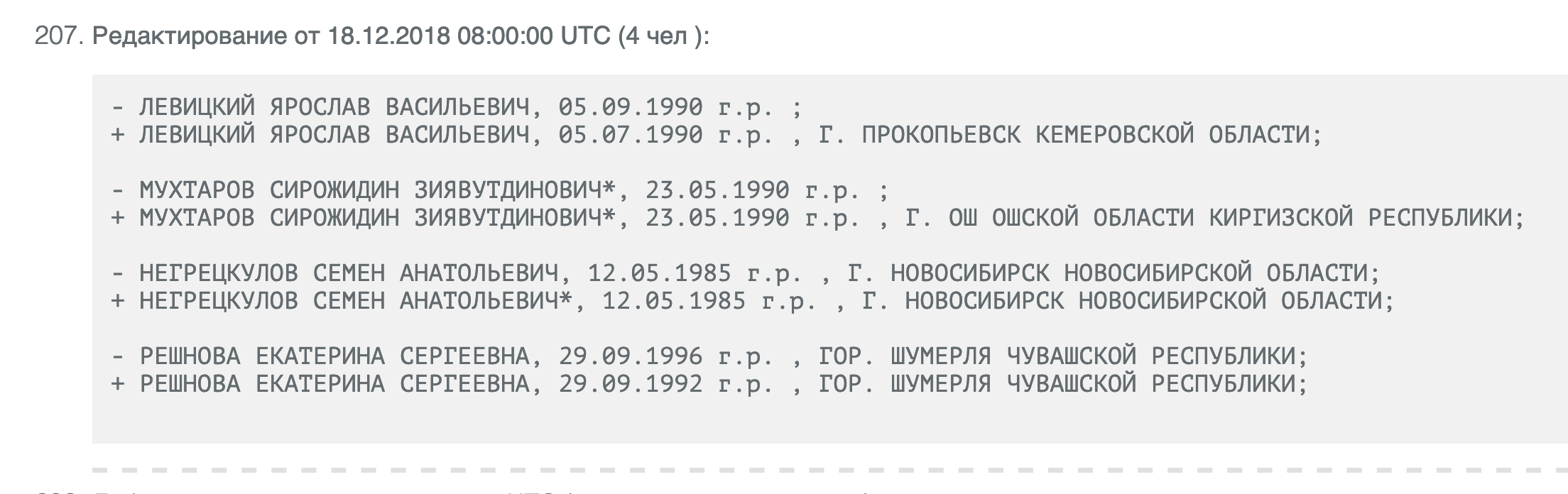 «Обычно меняют место рождения, ФИО — реже, дни рождения — еще реже, — отмечает сам разработчик сервиса и вспоминает пример. — Абдурахимов Шахриер Умедович. Ему исправили одну букву "е" на "ё" 6 мая 2019 года. И при этом не указали предыдущий вариант написания в скобочках, как у других. Лишь спустя пять месяцев, 3 октября, сделали ему двойное написание».
