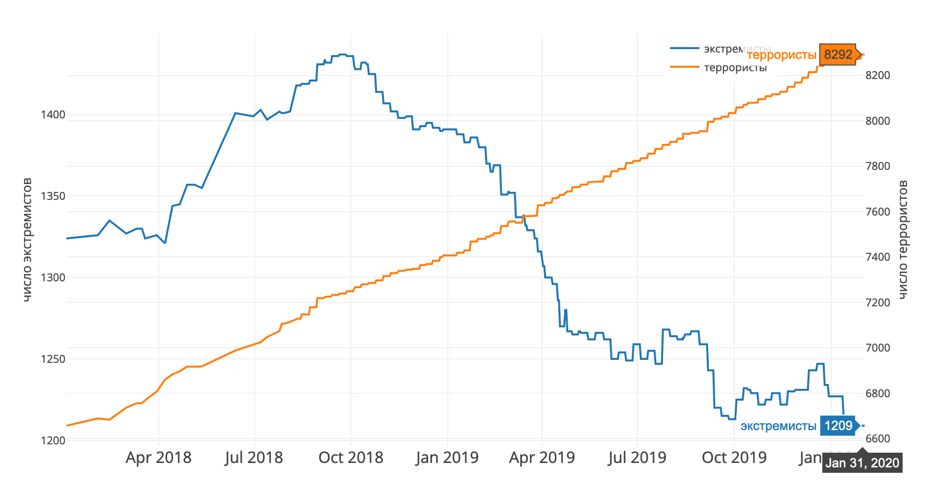 График роста численности «экстремистов» и «террористов» в списке Росфинмониторинга с сайта Шукшина. Снижение числа «экстремистов» начинается с октября 2018 года, когда Владимир Путин внес в Госдуму законопроект о частичной декриминализации статьи 282 УК.