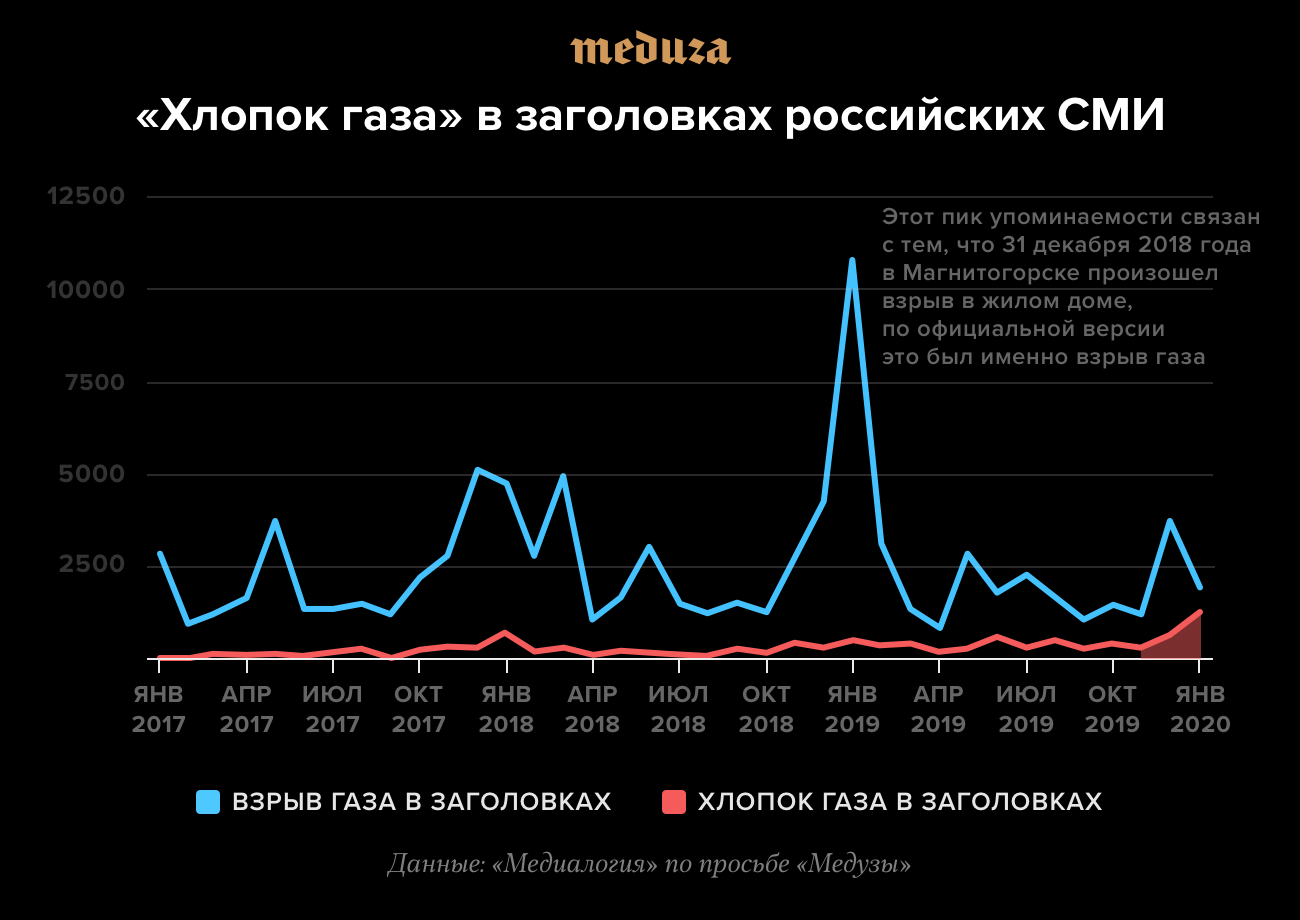 «Медиалогия» «Медуза» заказала «Медиалогии» исследование об использовании словосочетаний «взрыв газа» и «хлопок газа» (чтобы не засорять результаты выражениями типа «взрыв недовольства» или омонимом «хло́пок») в заголовках российских СМИ с января 2017 года по январь 2020-го. Пик января 2019-го связан со взрывом жилого дома в Магнитогорске утром 31 декабря 2018-го. Официальная версия этого происшествия — взрыв бытового газа, хотя некоторые журналисты предполагали и другое: например, Baza настаивает, что это был теракт.