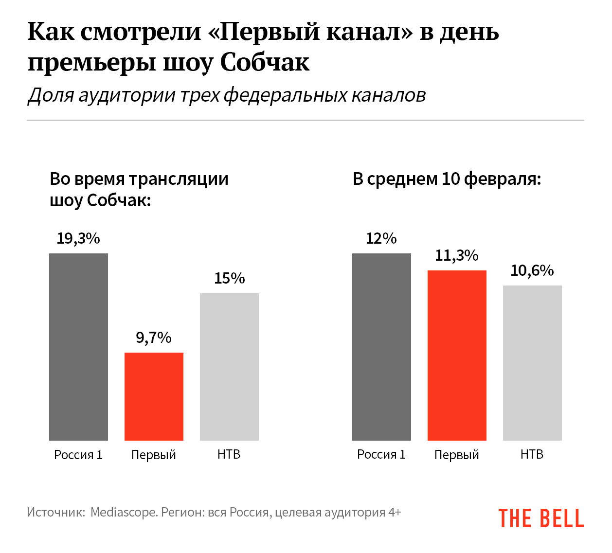 Это ниже среднесуточной доли «Первого канала» в тот же день на полтора процентных пункта (9,7% против 11,2%) и незначительно выше средней доли «Первого» за январь—начало февраля 2020 года (9,5%). При этом следует учитывать, что шоу Собчак выходит не в прайм-тайм — в 22:30.