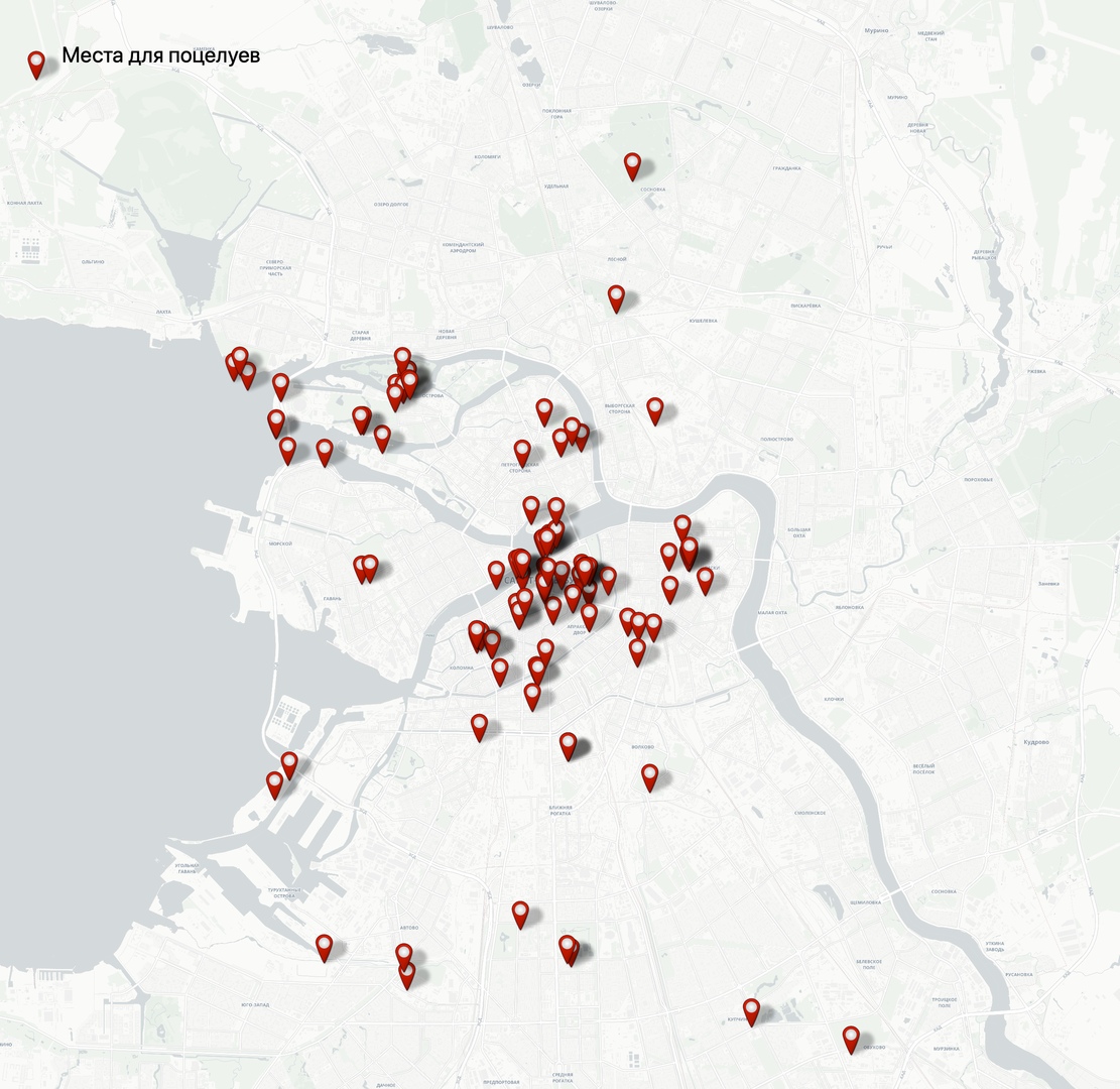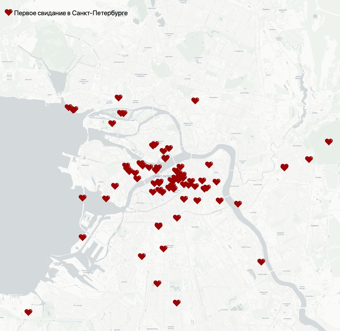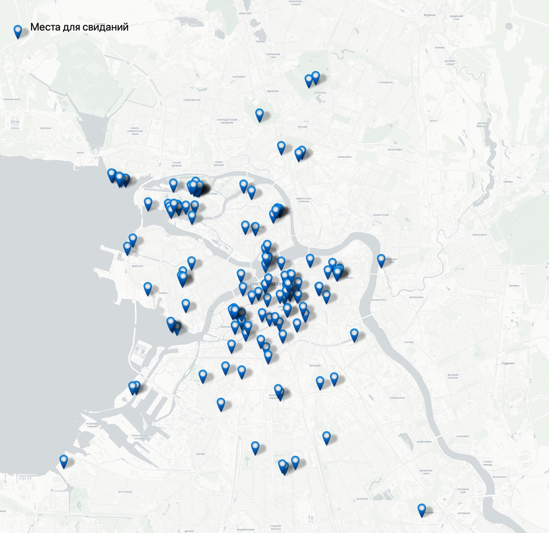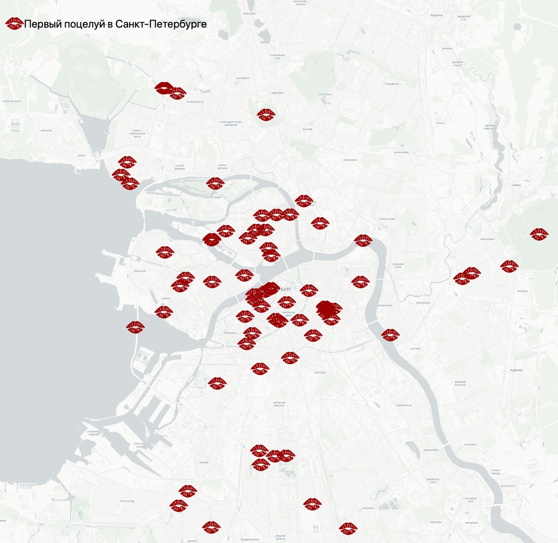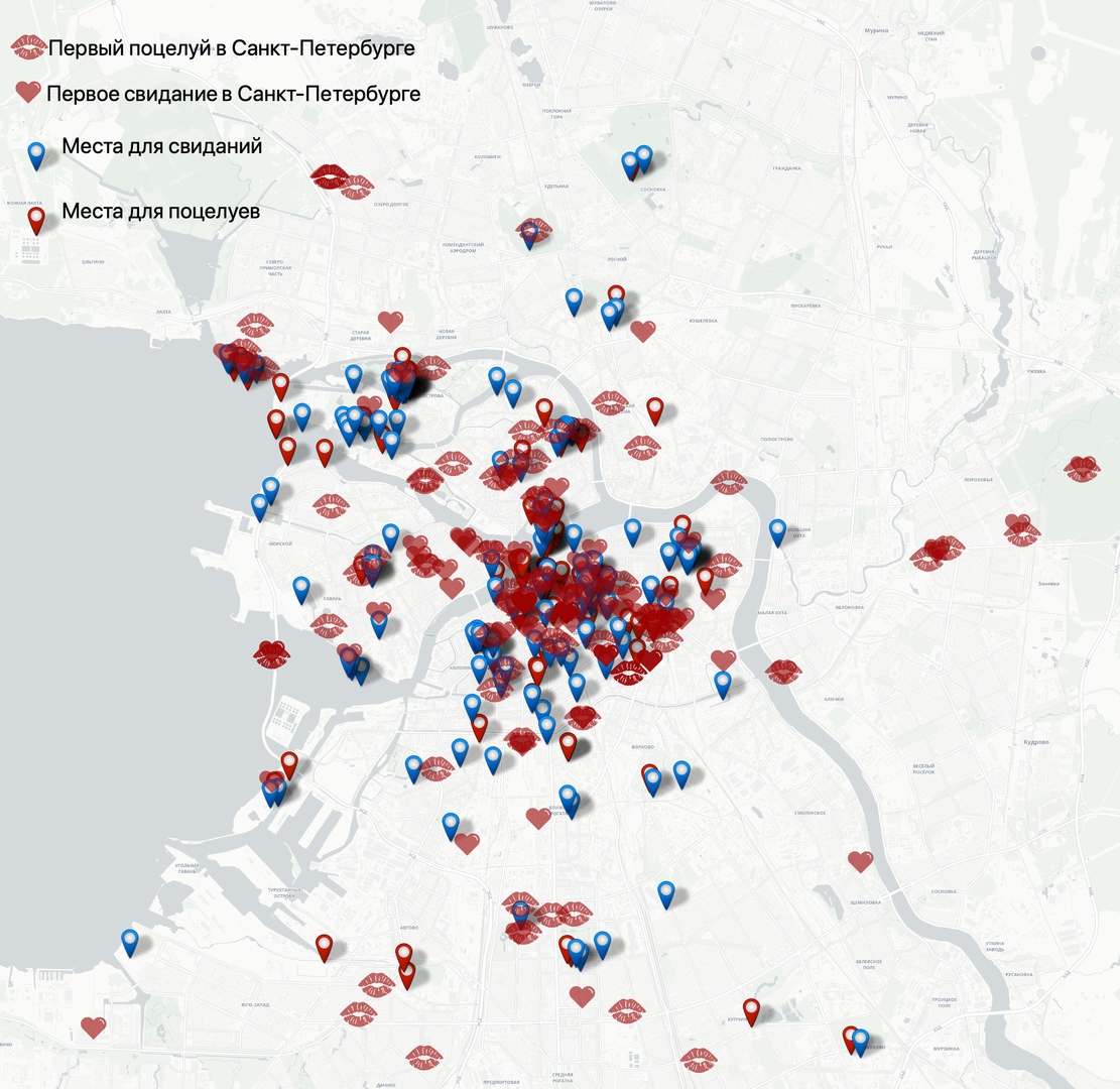 Больше всего поцелуев произошло в торговых центрах, кино, кафе и других местах рядом с метро, а также дома. На первые свидания петербуржцы ходили в парки и сады города, например, на Елагин остров и в Парк 300-летия, а также в заведения вдоль проспектов и линий — Невского проспекта, Вознесенского проспекта, 1-й и 12-й линий Васильевского острова.