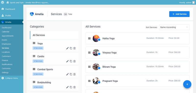 В разделе «Services» создаем категорию (если даже она будет одна) и затем добавляем в нее услуги (кнопка «Add Service» справа вверху). В открывшейся карточке услуги добавляем название, категорию, продолжительность и цену (если нужно).