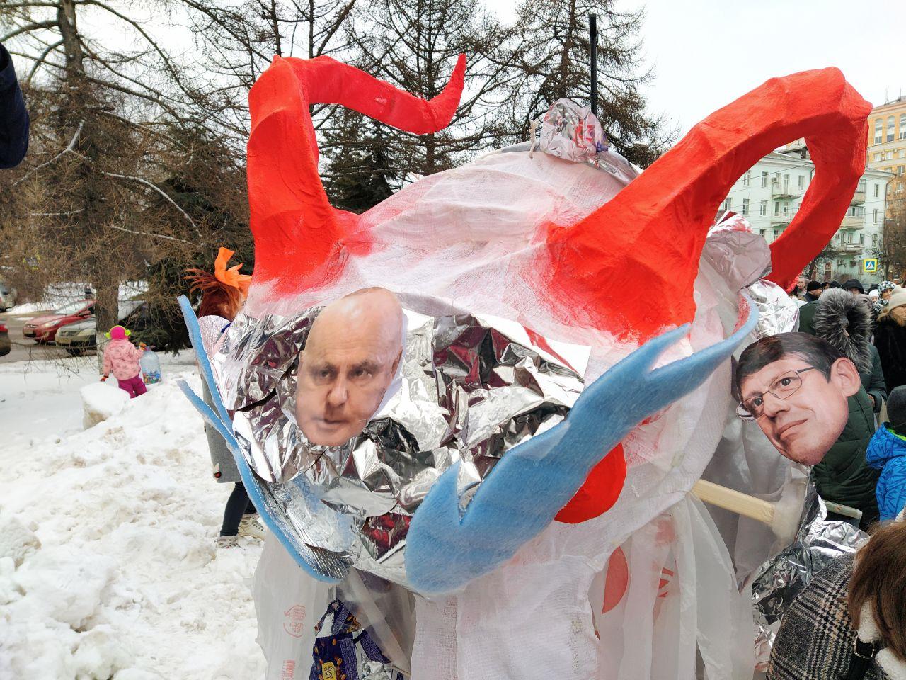 Во время митинга организаторы прохаживались по площади с огромным чучелом чудовища, сделанного из вторсырья – так называемой “мусорной гидры”. Несмотря на предполагаемую многоголовость “гидры”, голова у дракона, похожего на китайского, была одна, но по всему туловищу чудовища были наклеены лица людей, причастных к мусорным проблемам в областной столице.