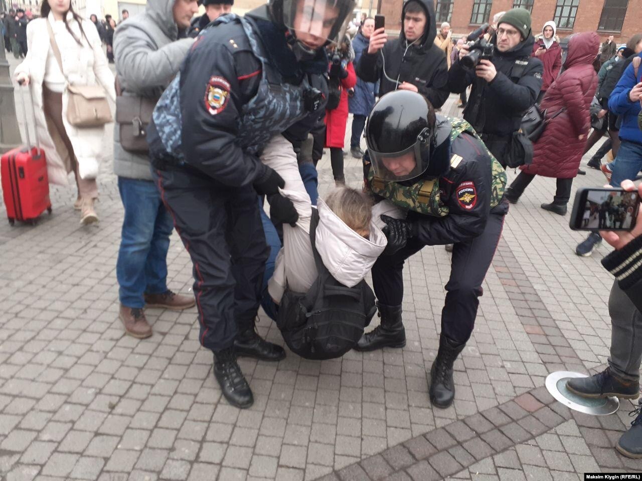 Сначала задержали активиста Евгения Мусина. Он не успел вытащить плакат из пакета. Его увели в автозак. Как уточнил помощник депутата Бориса Вишеневского Дмитрий Гусев, Мусина задержали по административному производству, возбужденному в Приморском районе.