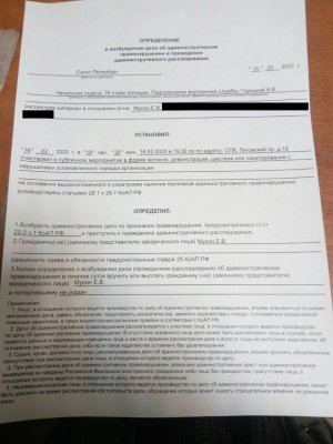 22:20 Полиция возбудила против Мусина административное дело по статье о нарушении организатором акции правил проведения мероприятия (ч. 1 ст. 20.2 КоАП). Об этом ОВД-Инфо рассказал сам Мусин.