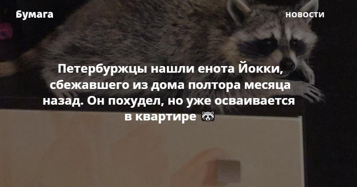 Петербуржцы нашли енота Йокки, сбежавшего под Новый год. Вот первые кадры с ним! 🦝 pic.twitter.com/e9ICGB2bgd