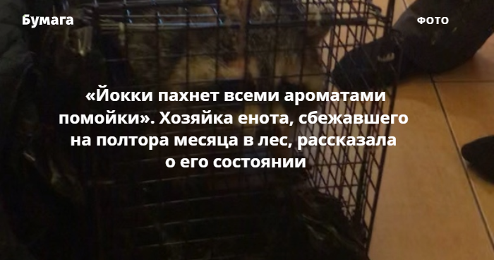 Ранее муж Ирсалиевой, Антон Васильев рассказывал «Бумаге», что сначала Йокки был в сильном стрессе, но вскоре освоился и стал бегать по квартире. Хозяин отметил, что за полтора месяца енот похудел.