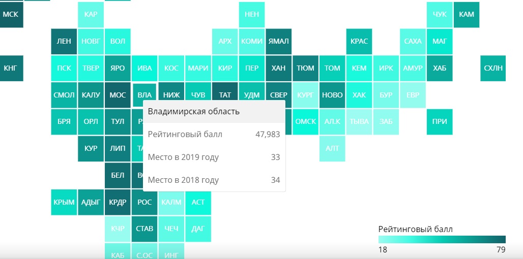 Владимирская область получила более 47-ми баллов, что выше среднего показателя. Лидерами списка стали Москва, Санкт-Петербург, Московская область, Республика Татарстан и Белгородская область.
