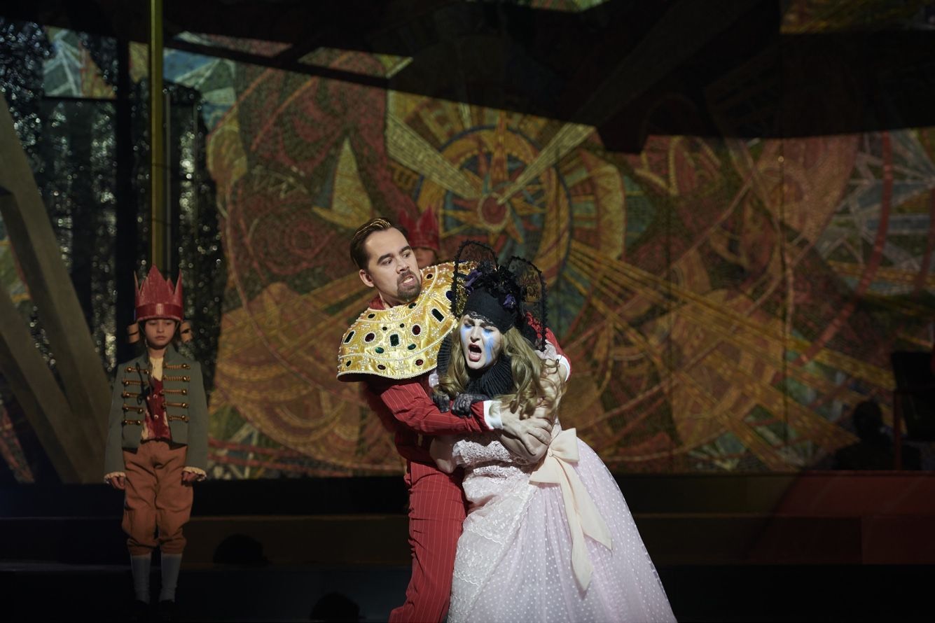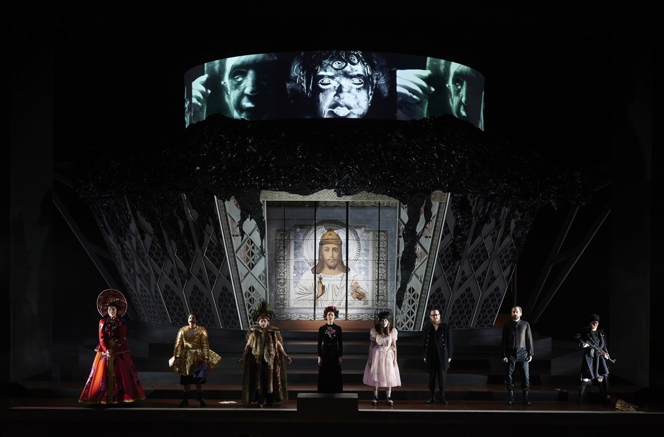 The set, imagined and designed by a young German team, looks like a primer on Russian memes of yore: The stereotypes range from kokoshniki (upright women’s headdresses) to Kalashnikov rifles. Apparently relying on the assumption that overdoing everything is an inherent component of the Russian spirit, director Paul-Georg Dittrich attacks his viewers from multiple angles. Characters pop up in side boxes and at the very back of the theater; screens glint in every corner; video montages cut in and out onstage, sending the audience from the Soviet cartoon version of Swan Lake to contemporary German art by Vincent Stefan. The dominant colors in the room are red, black, and gold. During Boris’s coronation scene, the tsar is decked out in tight gold latex; he later appears robed in a modern-day tracksuit. The shrewd boyar Shuisky flaunts what looks like a red vinyl raincoat. The Holy Fool has an enormous cross etched onto his belly. Pimen, the devout monk, is husky but perverse in a swaddle of black ribbons. The boyar chorus strides across the stage in Putin and Gorbachev masks. Notably un-devout ‘wandering monks’ Varlaam and Misail smoke hookah in the countryside. Grisha Otrepyev, the false tsar and the opera’s central villain, has become a young woman in this production. For some reason, his role is played by three different singers, most notably soprano Ramina Abdulla-Zade.