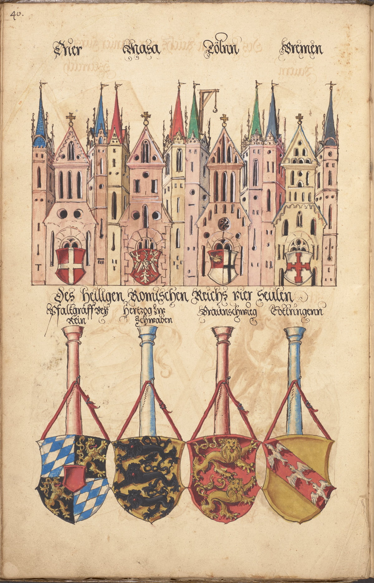 Фото: John Rylands Library В Библиотеке имени Джона Райландса, входящей в состав Манчестерского университета, эта книга значилась под индексом German MS. 2 и долгое время оставалась неизученной. На обложке ее имелась надпись Deutsches Stammbuch «Немецкая родовая книга». Когда Бен Поуп приступил к изучению книги, он сразу понял, что это не генеалогический справочник, а пособие иного рода — так называемый «гербовник». Книга содержит раскрашенные вручную изображения более 1800 гербов. По традиции того времени начинается она с выдуманных гербов исторических персонажей, затем следуют гербы городов и церквей, а потом множество гербов знатных родов Священной Римской империи.