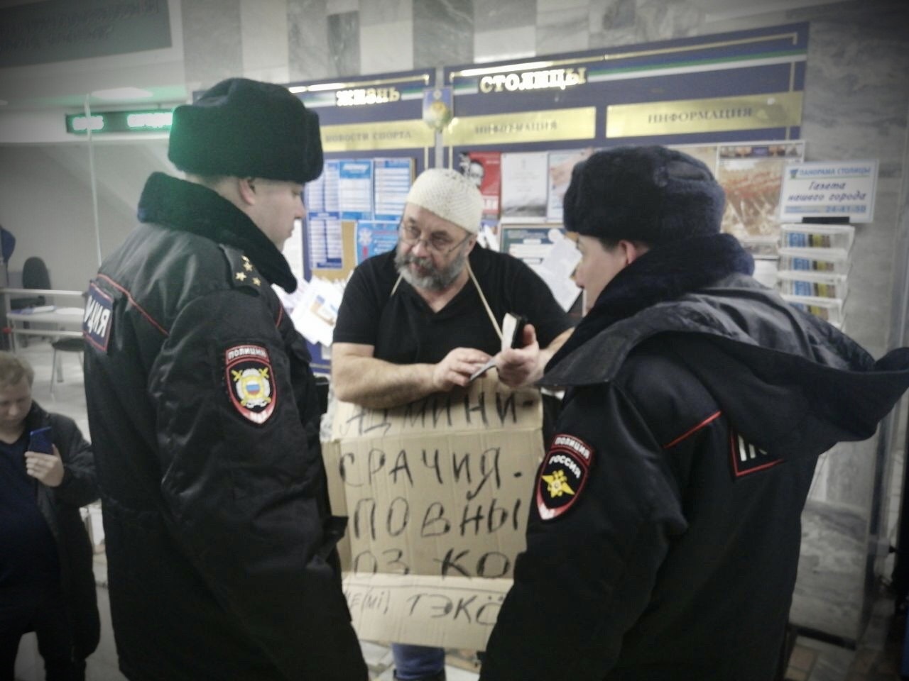 Администрачия - повны оз ков, ми тэкӧд (коми) - Администрация - боятся не надо, мы с тобой! - написано на плакате Андрея Ивашева.