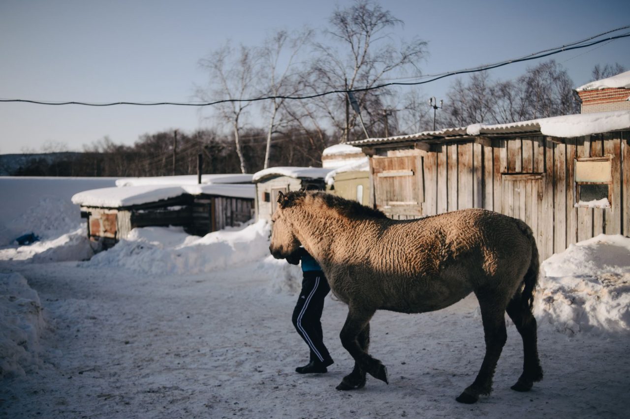 Поселок Чныррах. Вид с реки АмурФото: Константин Чалабов для ТД Денис говорит, что примерно через год директор комбината захотел купить еще несколько лошадей: «Я давай обзванивать казаков. Меня выводят на читинскую государственную конюшню. Я созваниваюсь с ними. Они: «Короче, приезжайте! Есть забайкальский кучерявый конь!» Берем КамАЗ, на него ставим контейнер. И мы отсюда на КамАЗе — я, водитель — вдвоем до самого Нерчинска (город в Забайкальском крае в 2,8 тысячах километров от Николаевска-на-Амуре — прим. ТД) ехали туда».