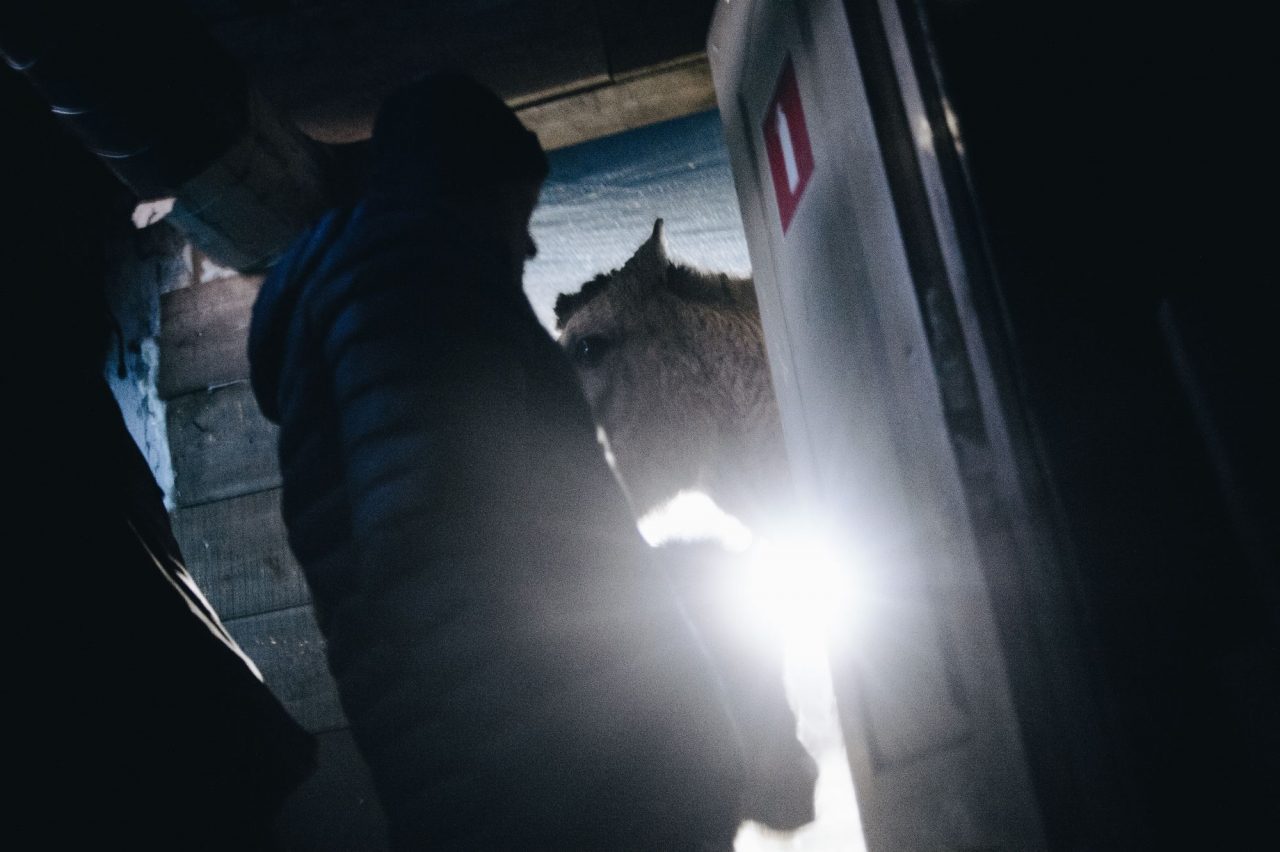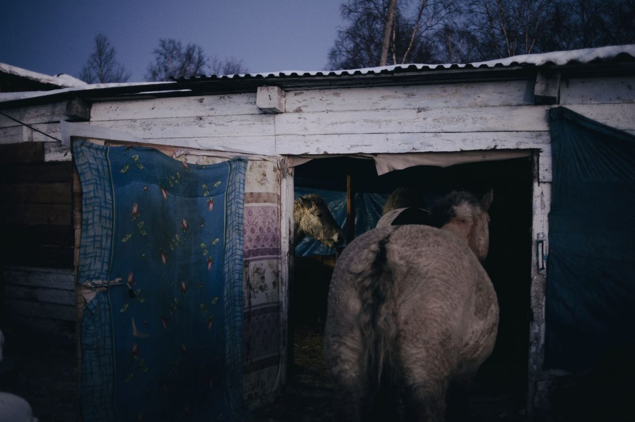 Несколько школьников остались, среди них — главный помощник Долгополова, Коля. Сейчас Коле девятнадцать — недолго проучился в техникуме, бросил учебу, пошел работать на конюшню. Он встречает нас в предбаннике холодной избы: камуфляжные штаны, черная куртка, черная шапка обрамляет круглое лицо. Но разговоров поначалу избегает — отворачивается и начинает выкладывать в печке щепки, ровно, слой за слоем.