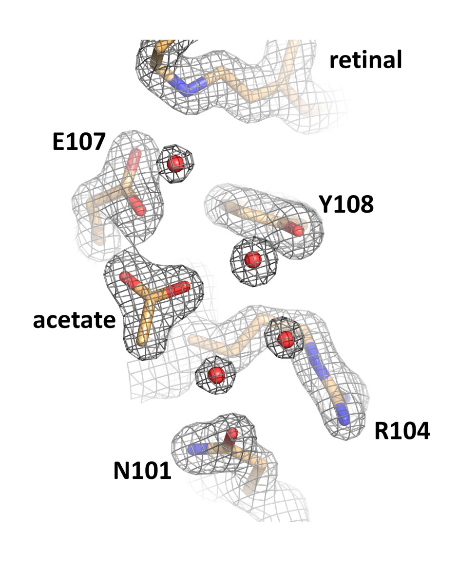 Карты электронной плотности высокого качества определяют наличие аниона ацетата в активном центре гелиородопсина 48С12. Изображение предоставлено авторами исследования Ученые смогли проанализировать структуру белка 48C12 в двух состояниях и сравнить ее со структурами других микробных родопсинов. Так, было показано, что внутри белка, в его цитоплазматической части, находится полость, заполненная большим количеством молекул воды. В одном из полученных состояний белка в полости была обнаружена молекула ацетата. Таким образом, полость может играть роль «активного центра» белка, в котором происходит связывание субстрата, такого как нитрат или карбонат. Несмотря на это предположение авторов, функция и биологическая роль гелиородопсинов остается неизвестной.