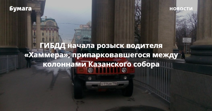 Дорожная полиция Петербурга начала розыск водителя «Хаммера», припарковавшегося между колоннами Казанского собора. Об этом «Бумаге» сообщили в отделе пропаганды ГИБДД по Петербургу и Ленобласти.