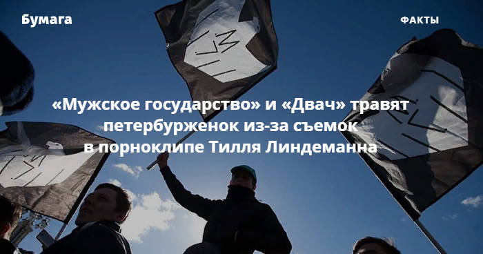 Солист немецкой группы Rammstein Тилль Линдеманн опубликовал порнографический клип, снятый в Петербурге. В ролике он занимается сексом с несколькими девушками. Движение «Мужское государство» и пользователи «Двача» организовали травлю актрис: им угрожают расправой в соцсетях. Девушки говорят, что в интернете также опубликовали их адреса.