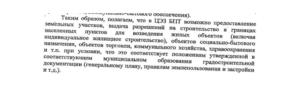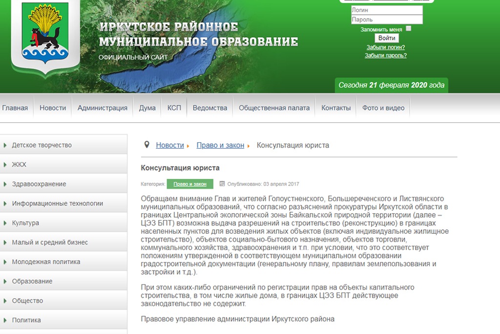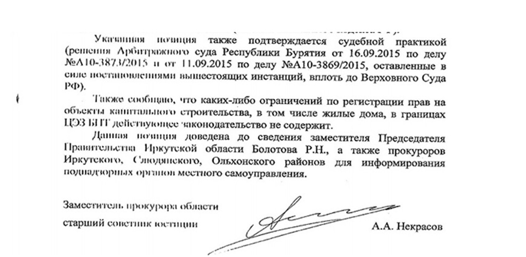 Через какое то время, администрацией Иркутского района было доведено до глав муниципальных образований, что согласно разъяснений прокуратуры Иркутской области в границах Центральной экологической зоны Байкальской природной территории (далее — ЦЭЗ БПТ) возможна выдача разрешений на строительство (реконструкцию) в границах населенных пунктов для возведения жилых объектов (включая индивидуальное жилищное строительство), объектов социально-бытового назначения, объектов торговли, коммунального хозяйства, здравоохранения и т. п. при условии, что это соответствует положениям утвержденной в соответствующем муниципальном образовании градостроительной документации (генеральному плану, правилам землепользования и застройки и т. д.). Проще говоря — если ты имеешь участок с назначением под строительство индивидуального жилого дома, если в генплане поселка указанная земля предназначена для размещения жилых домов, то ты можешь строить себе индивидуальный жилой дом. Кстати говоря, на сайте администрации Иркутского района, по сей день «висит» данный текст: