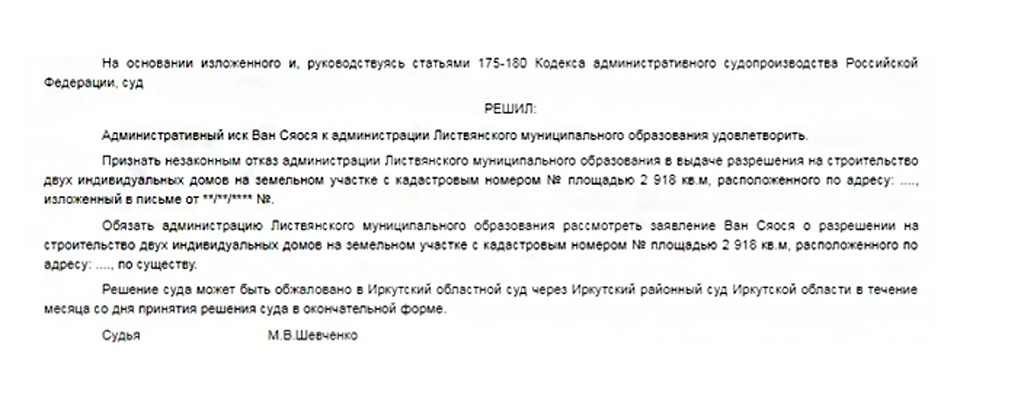 После вынесения указанного решения мы подали в апелляционную инстанцию (Иркутский областной суд) и отменили решение суда первой инстанции и я лично отменил выданное решение.