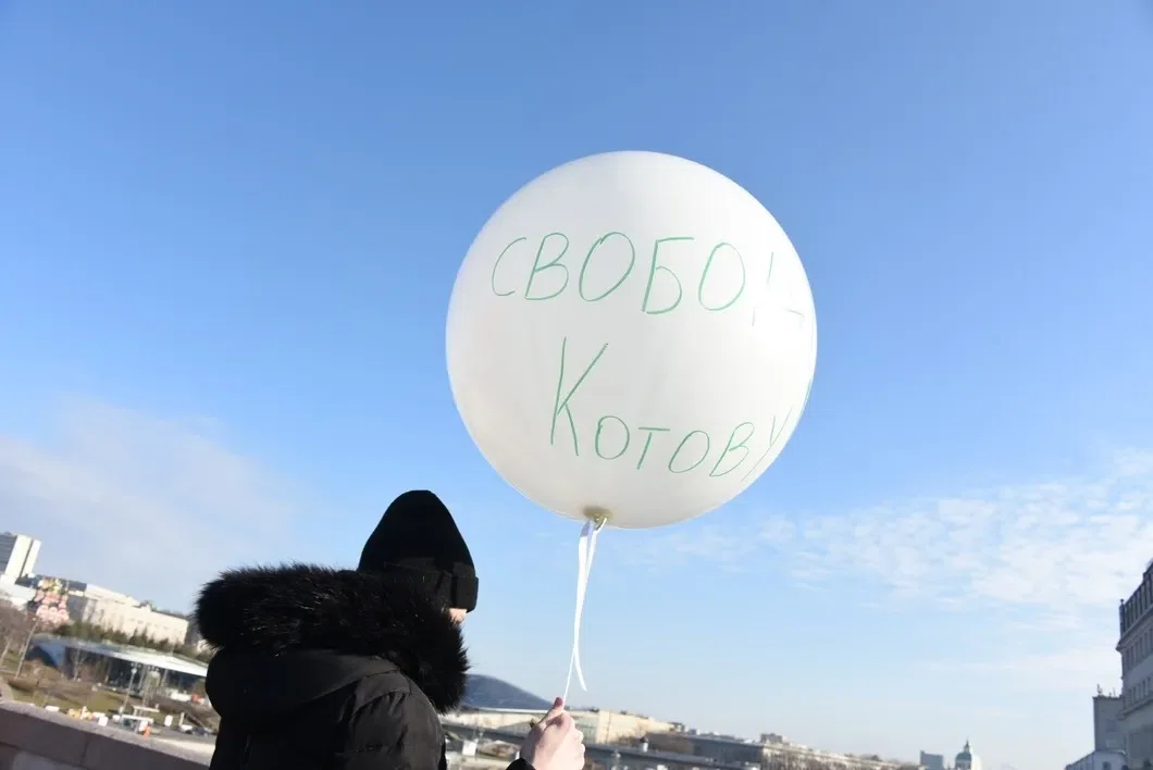 Активисты запустили несколько шаров цветов российского флага на фоне Кремля в честь 35-летия Константина Котова.