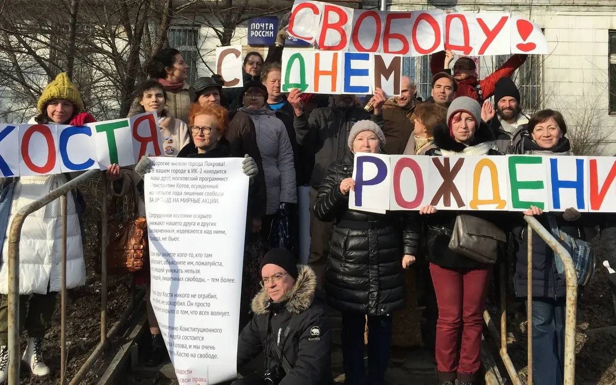 В сентябре 2019 года Константина Котова осудили на 4 года колонии общего режима по статье 212.1 УК РФ (неоднократное нарушение правил установленного порядка проведения собрания, митинга, демонстрации, шествия или пикетирования). В первый раз Котова задержали на пикетах в поддержку аспиранта МГУ Азата Мифтахова, во второй – на стихийном сходе у здания ФСБ на Лубянке в поддержку фигурантов дела «Сети», в третий раз – на шествии в поддержку журналиста Ивана Голунова. В последний раз Котов даже не успел достать плакат, его задержали у выхода из метро. Четырех эпизодов хватило для того, чтобы суд решил отправить активиста отбывать наказание в ИК-2 в городе Покрове.