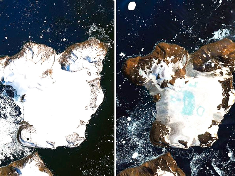 Там, где ранее на фото была видна белая ледяная шапка, теперь только коричневые островки земли. Растаявшие снег и лед создали водоемы. Таковы последствия рекордно высоких температур в Антарктике.