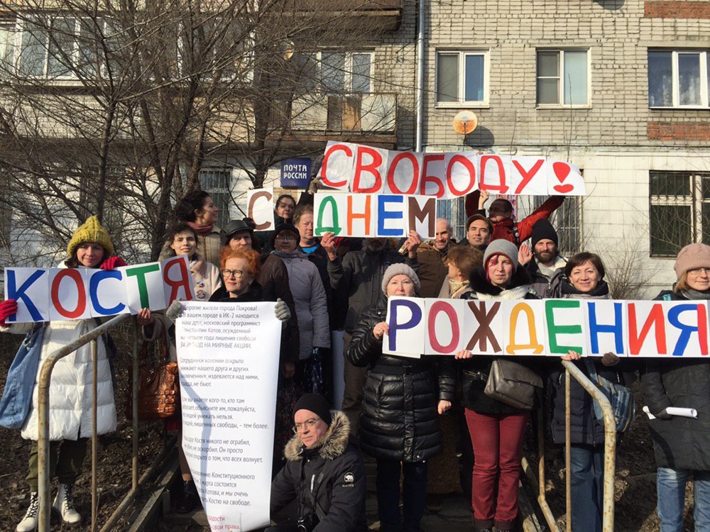 Фигурант “Московского дела” Константин Котов отбывает наказание в исправительной колонии в Покрове. 22 февраля ему исполнилось 35 лет. Его друзья и единомышленники приехали во Владимирскую область, чтобы провести серию акций в поддержку гражданского активиста.