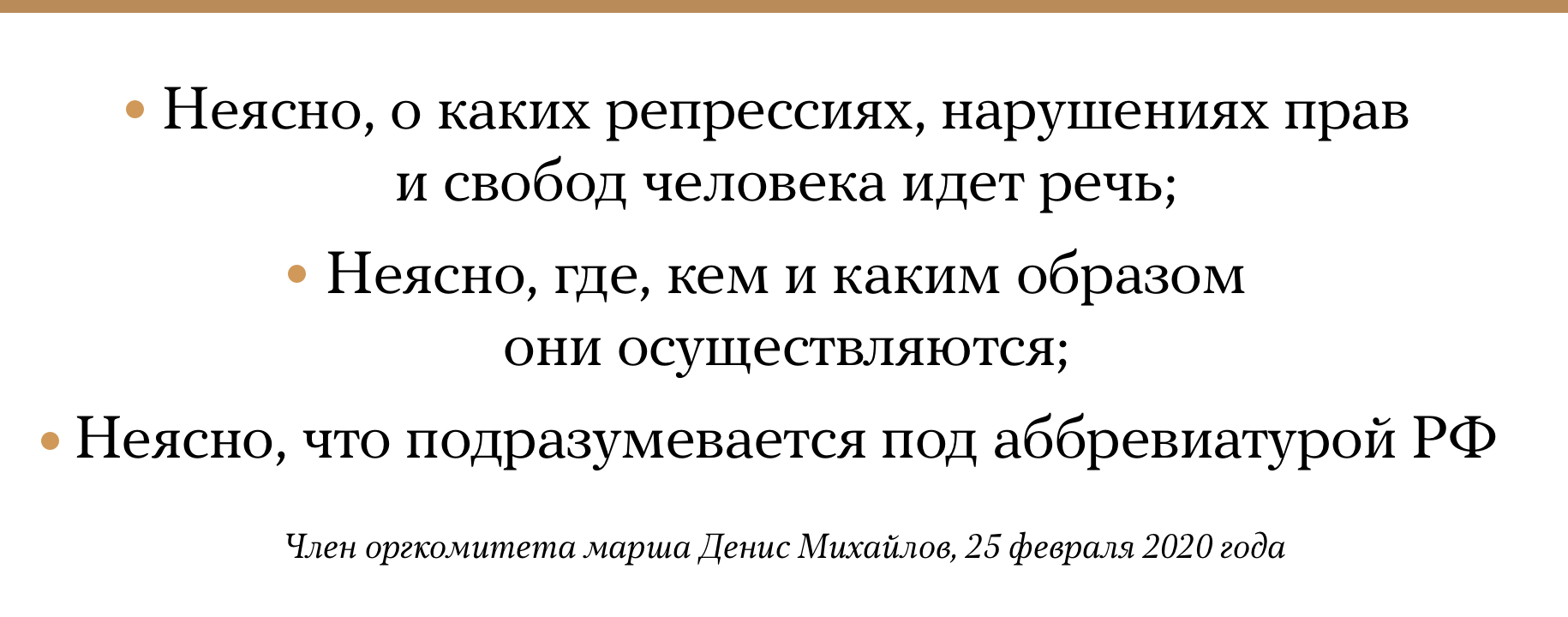 Комитет по правопорядку и законности Петербурга во второй раз отказал организаторам марша памяти Бориса Немцова в проведении шествия 29 февраля в центре города. Как сообщил в твиттере заявитель акции Денис Михайлов, среди причин отказа указывалось непонимание властями заявленных целей акции: «осуждение политических репрессий», «нарушения прав и свобод человека», «требование сменяемости власти в РФ». Отдельно чиновники отметили, что аббревиатуры РФ «в действующем законодательстве и Конституции Российской Федерации не существует».