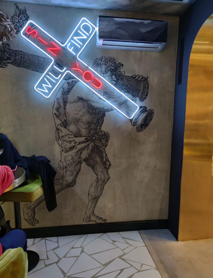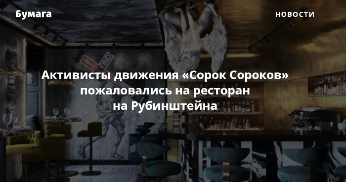 Юристы «Сорок Сороков» подготовили претензию к владельцам ресторана, в которой ссылаются на статью об оскорблении чувств верующих, пишет «Фонтанка». Православным активистам не понравилось то, что в заведении висит неоновый крест с надписью «грех найдет тебя», а над барной стойкой размещена скульптура обнаженной женщины с ангельскими крыльями.