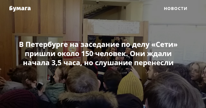 В Петербурге днем 25 февраля должно было состояться слушание по делу «Сети» — сообщества, признанного террористическим и запрещенного в России. На него, по подсчетам корреспондента «Бумаги», пришли около 150 человек.