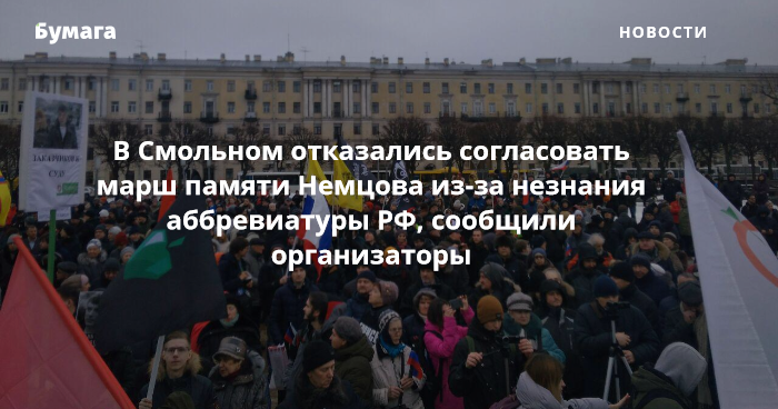 Власти Петербурга отказались согласовать марш памяти Немцова, который активисты хотели провести в городе 29 февраля. Об этом в твиттере сообщил член оргкомитета марша Денис Михайлов.