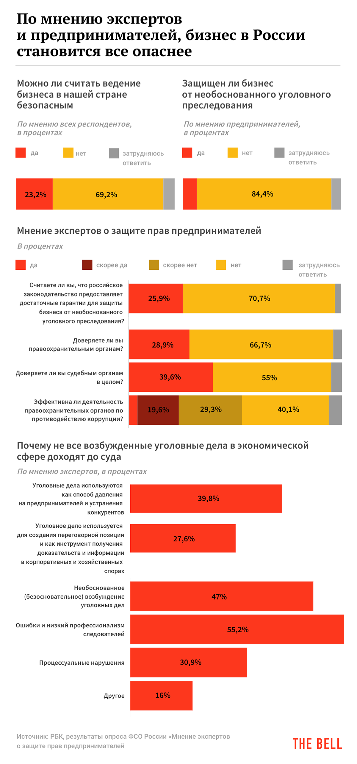 Читайте также Предприниматели считают бизнес в России небезопасным, не верят силовикам и опасаются уголовных дел