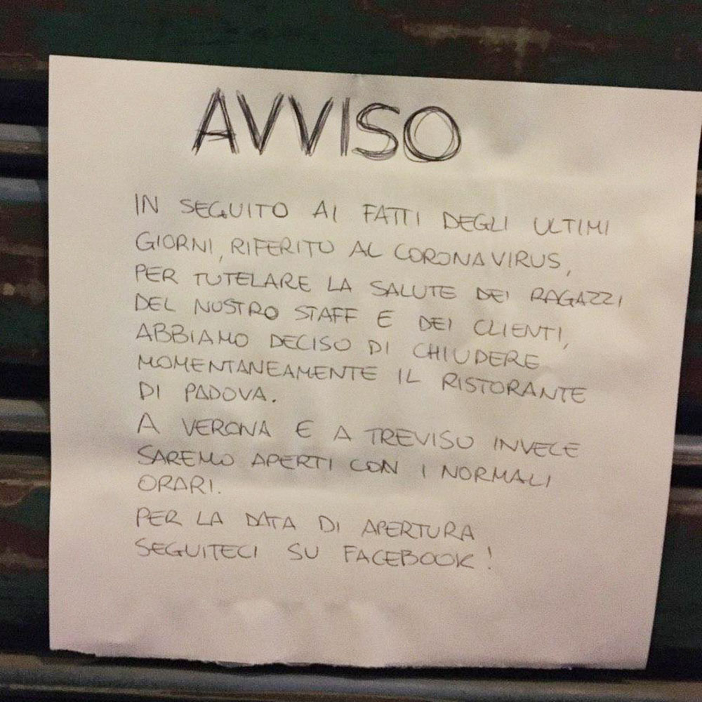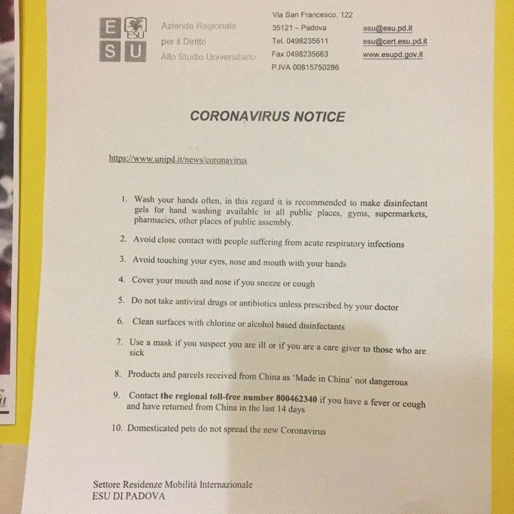 В Падуе закрыли все музеи и капеллу Скровеньи, до первого марта. В воскресенье я была в Венеции, ходила смотреть Коллекцию Пегги Гуггенхайм, музеи еще работали. На следующий день, в понедельник, их закрыли. В Венеции все полицейские, кстати, были в масках. Там дезинфицируют транспорт — вапоретто, их речные трамвайчики. В Падуе я подобного пока не видела, но то, что я этого не видела, не значит, что этого нет. Зато на всех дверцах аптек висят листовки с чем-то вроде карточек «Медузы», как обезопасить себя. Такая же листовка есть в моем общежитии, плюс университет прислал мне такое же сообщение на английском.