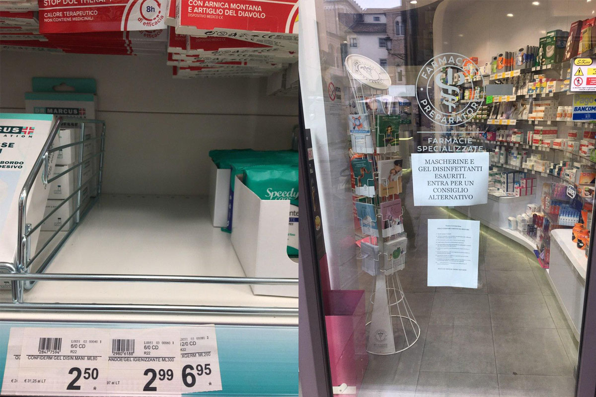 Ни масок, ни дезинфицирующих средств — ничего нет. На всех аптеках висят таблички о том, что закончились маски, закончились средства для дезинфекции рук. И это не только в Падуе. Вчера мы были в Болонье, там то же самое. И так не только в аптеках, но вообще во всех местах, где можно было купить дезинфицирующие средства. Например, в магазине Flying Tiger Copenhagen