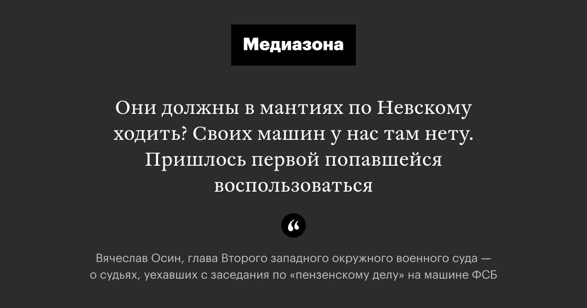 Председатель Второго западного окружного военного суда Вячеслав Осин сказал, что тройка судей по делу «террористического сообщества "Сеть"», уехавшая после заседания на автомобиле ФСБ, воспользовалась «первой попавшейся» машиной.