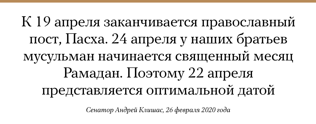 Сопредседатель рабочей группы по подготовке поправок в Конституцию, сенатор Андрей Клишас предложил провести общероссийское голосование по этим поправкам 22 апреля и сделать этот день выходным (Владимир Путин согласился). Выбор даты Клишас объяснил религиозными праздниками православных христиан и мусульман. О том, что голосование по поправкам может пройти 22 апреля, ранее сообщали источники РБК и «Интерфакса». РБК писал, что идея с датой принадлежала администрации президента и что 22 апреля 2020 года будет отмечаться 150-летие со дня рождения Владимира Ленина.