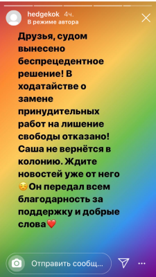 Администрация исправительного центра, где Кушнер отбывает наказание, в своем ходатайстве просила суд заменить осужденному исправительные работы на лишение свободы. Однако суд с доводами сотрудников учреждения ФСИН не согласился. В каком именно суде проходило заседание, в блоге не уточняется.