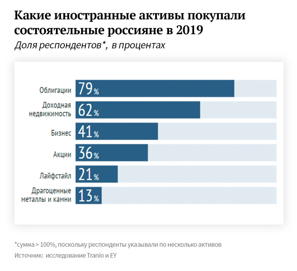 Самый популярный актив для зарубежных инвестиций — облигации: их назвали 79% респондентов. Долговые бумаги вдвое популярнее более рискованных инвестиций на рынке акций (36%). На втором месте — доходная недвижимость, которую планируют сдавать или перепродавать, — 62%. Остальные инструменты заметно менее популярны: об инвестициях в бизнес рассказал 41% респондентов, в элитную недвижимость, яхты и антиквариат — 21%. В драгметаллы и камни — только 13%. В результате получается больше 100%, поскольку один и тот же респондент может называть разные активы, поясняют авторы исследования.