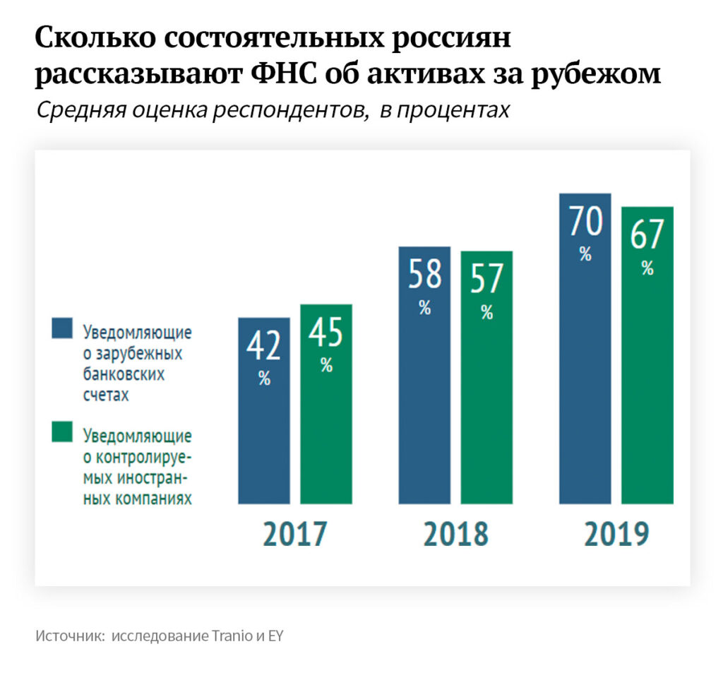 С тех пор как Россия в 2016 году присоединилась к международному автоматическому обмену налоговой информацией, число миллионеров, которые рассказывают ФНС о своих зарубежных счетах, стало расти (The Bell подробно объяснял, кому надо отчитываться). В 2019 году доля состоятельных россиян-резидентов, которые уведомили налоговую о своих иностранных счетах, составила 70%, о счетах своих контролируемых иностранных компаний (КИК) — 67%. Для сравнения, в 2017 году их было 42% и 45% соответственно.