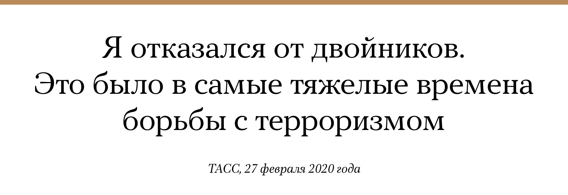 Владимир Путин сообщил в большом интервью ТАСС, что у него нет двойников, а сам он — настоящий. Во время беседы журналист Андрей Ванденко показал президенту популярные поисковые запросы по фамилии Путин, в том числе «Путин двойник доказательства». По словам президента, тема двойника возникала в начале 2000-х годов, но он отказался от дублеров. Таким образом, Путин косвенно прокомментировал конспирологическую теорию о том, что у него есть двойники, которых якобы зовут «Удмурт», «Банкетный» или «Говорун».