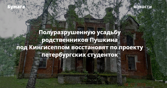 Усадьбу родственников Александра Пушкина Роткирхов-Лелонгов отреставрируют по проекту студенток Петербургского государственного архитектурно-строительного университета. Об этом сообщает отдел по связям с общественностью СПбГАСУ.