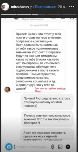 Томскому ведущему и блогеру Руслану Мирзаханову предложили деньги за посты в соцсетях в поддержку предлагаемых российскими властями поправок в Конституцию. Переписку с известным в Томске SMM-специалистом Маратом Ахметшиным он опубликовал на своей странице в Instagram.