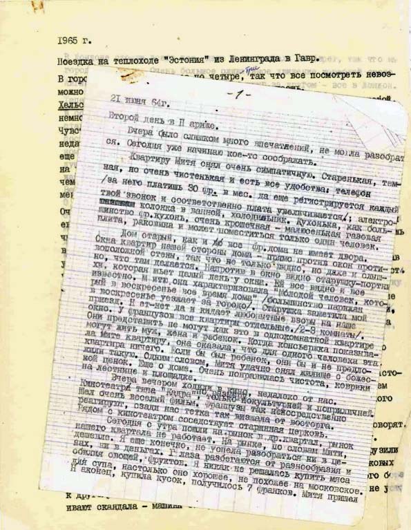 «Были вчера в Латинском квартале. Группа студентов собралась на набережной Сены, поют, играют на гитаре. Вид оборванный, экстравагантный. У ребят волосы до плеч, бороды, в рваных башмаках на босу ногу, ноги грязные. Девчонки в брюках, курят. Полная свобода индивидуальности».