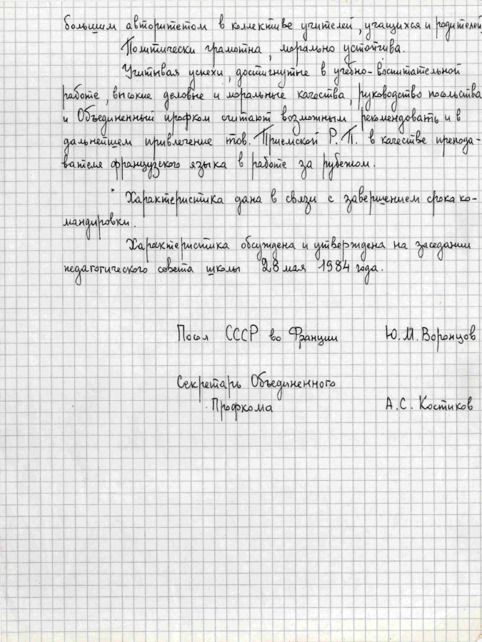 «Принципиальна, общительна, в быту скромна, пользовалась авторитетом в коллективе учителей, учащихся и родителей. Политически грамотна, морально устойчива. <…> Руководство посольства и Объединенный профком считают возможным рекомендовать и в дальнейшем привлечение тов. Приемской Р. П. в качестве преподавателя французского языка в работе за рубежом».